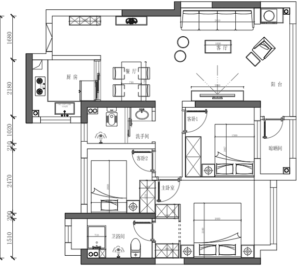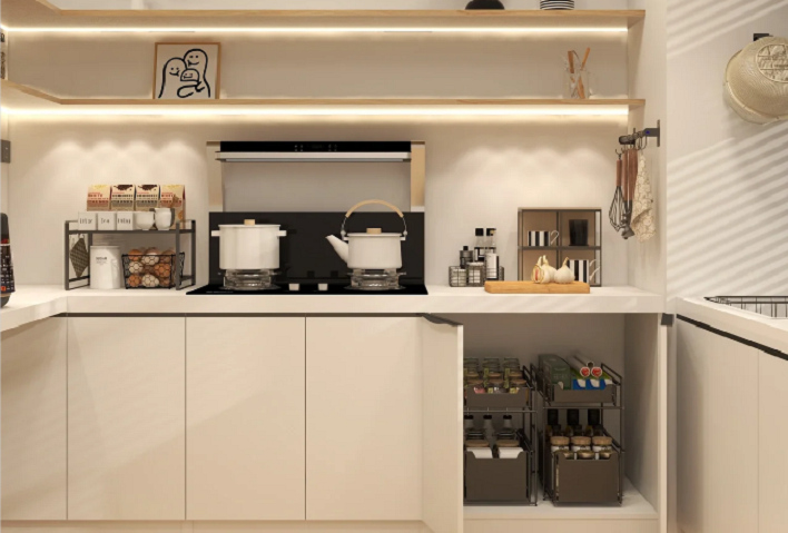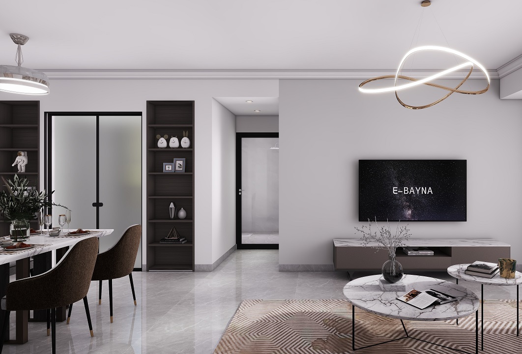 打開傳統廚房設置,加強廚房與餐廳一體化,緊密的將廚房與餐廳一體化,拓寬了空間視野的同時也擴大了實際的空間層次。冰箱位置的放置也加強了業主實際的使用便利性。