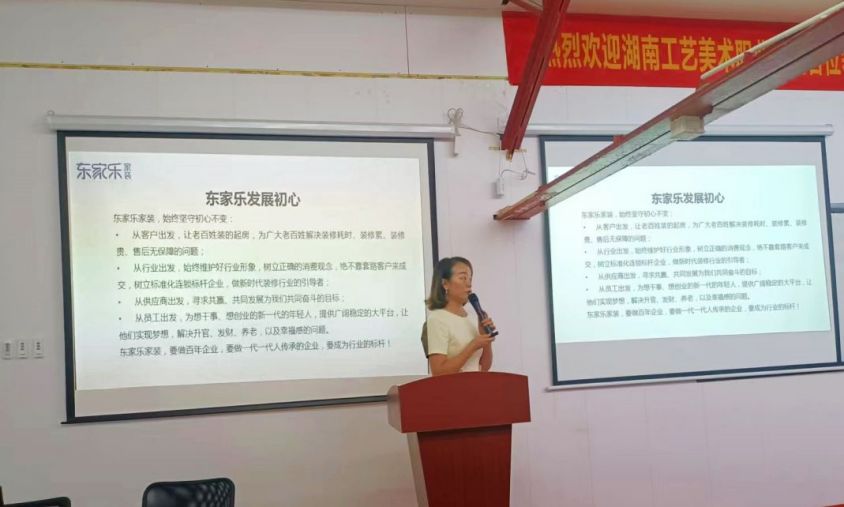 袁家嶺分公司總經理龍麗向校領導致歡迎詞,并向我們尊貴的來賓介紹東家樂家裝的發展初心和企業文化。