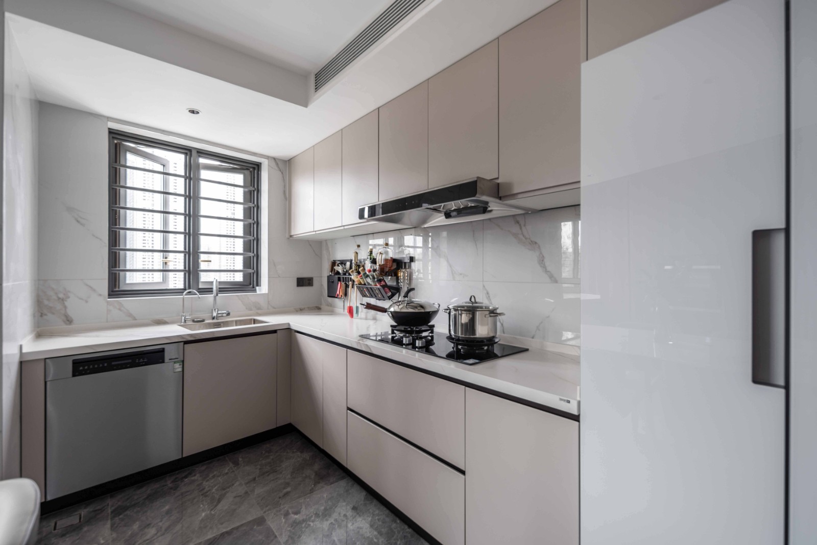 ??雙L型豪華型廚房,讓主婦們絕對享受烹飪之快樂,除了靠墻側操作區墻壁是是細長的實體窗外,其中央部分的“L”,臺面寬敞、光亮,彰顯奢華魅力。