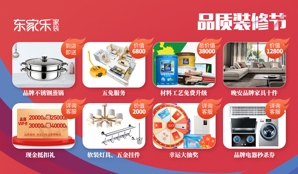 東家樂家裝聯合金杯電纜、多樂士、圣象地板、歐派、晚安家居、金意陶瓷磚、樂東家定制等數十家國內知名品牌為廣大業主讓利,大量一線品牌材料免費升級,提升材料品質但不提升價格。