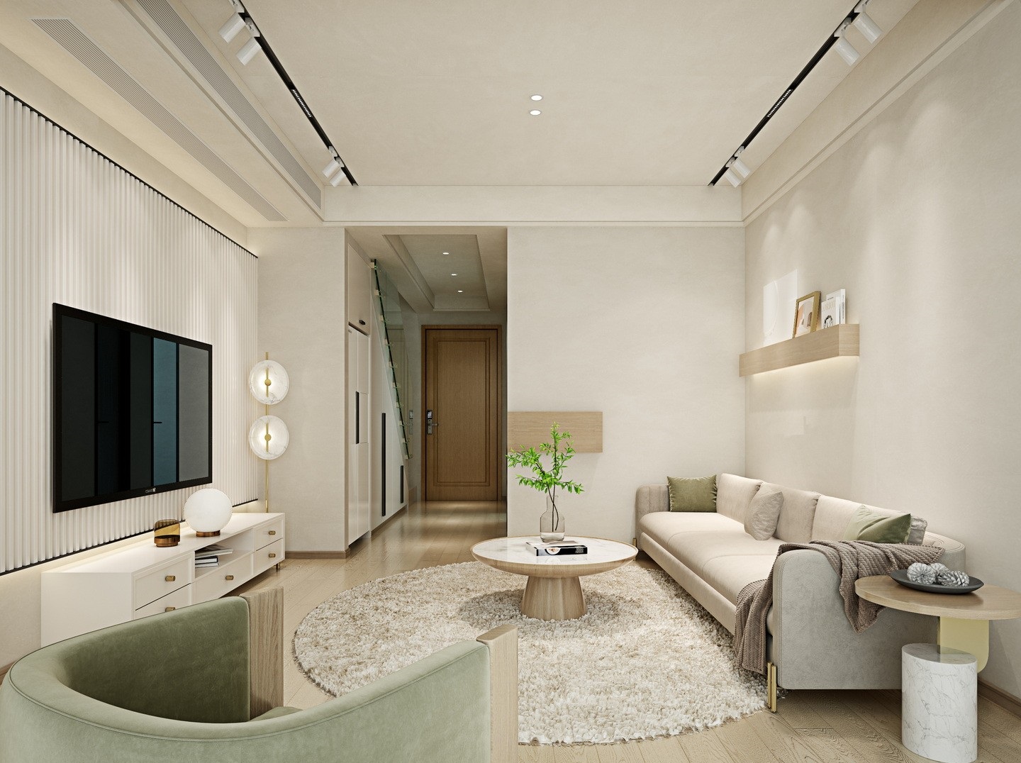 ??半隔斷背景墻:無論是小戶型還是大戶型,半墻隔斷電視背景墻簡直是驚艷的存在。可以起到隔斷的作用,把空間分隔成兩個(gè)獨(dú)立的空間,又不影響采光。比如橫廳就比較適合這種半隔斷電視背景墻。根據(jù)空間需求,定制平行或垂直于入戶門的半墻隔斷,改善采光的同時(shí)還具有收納隔斷的功能。