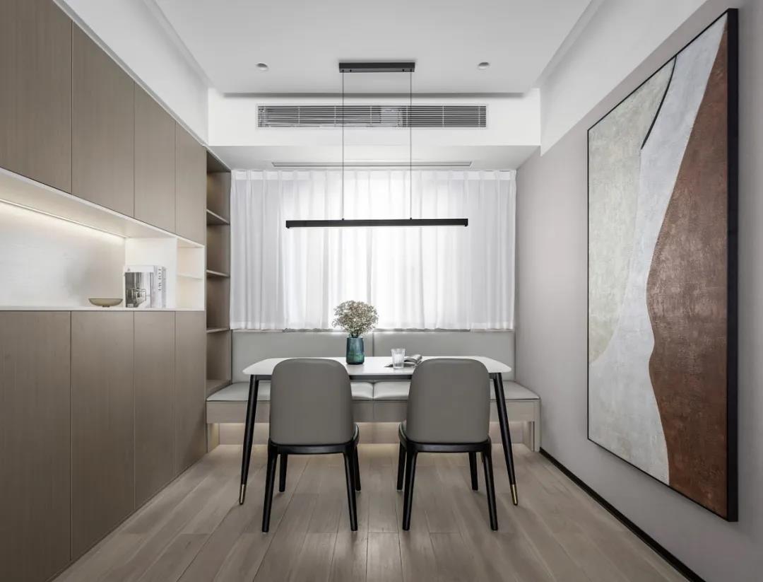 ??餐桌正對面就是一組白色餐邊柜,柜子中間采用鏤空設計,墻上還做了一塊隔板,用來放置小擺,吊柜下方裝了一排射燈,從各個角度看,都是美麗的;人間煙火氣,最撫慰人心,餐廳煙火氣的聚散,恰是世界上最溫馨的事物,與家人共享美食,即便是粗茶淡飯,也覺得幸福、美好。