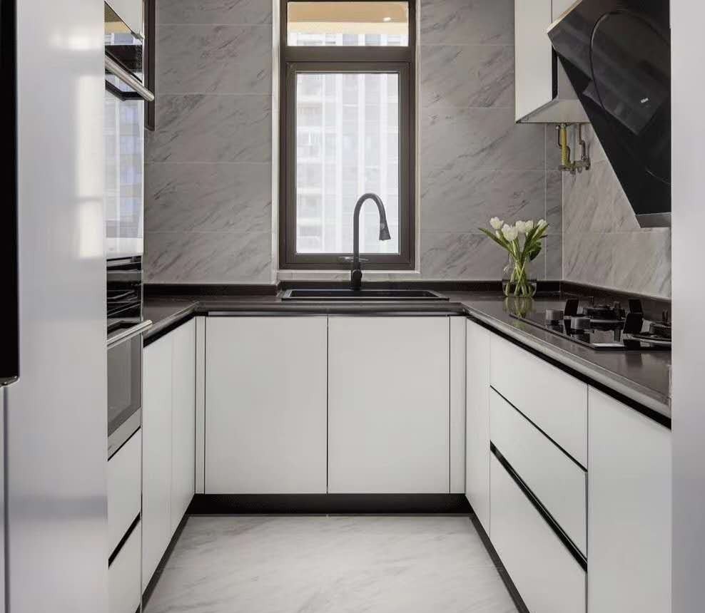 4、選擇合適的顏色:在選擇U型廚房的顏色時,也要考慮到其重要性。可以選擇一些明亮的顏色,例如白色和灰色,來增加空間感和采光。同時,可以在墻面、櫥柜和地面上選擇不同的顏色和材料進(jìn)行搭配,以創(chuàng)造出更加令人舒適的視覺效果。