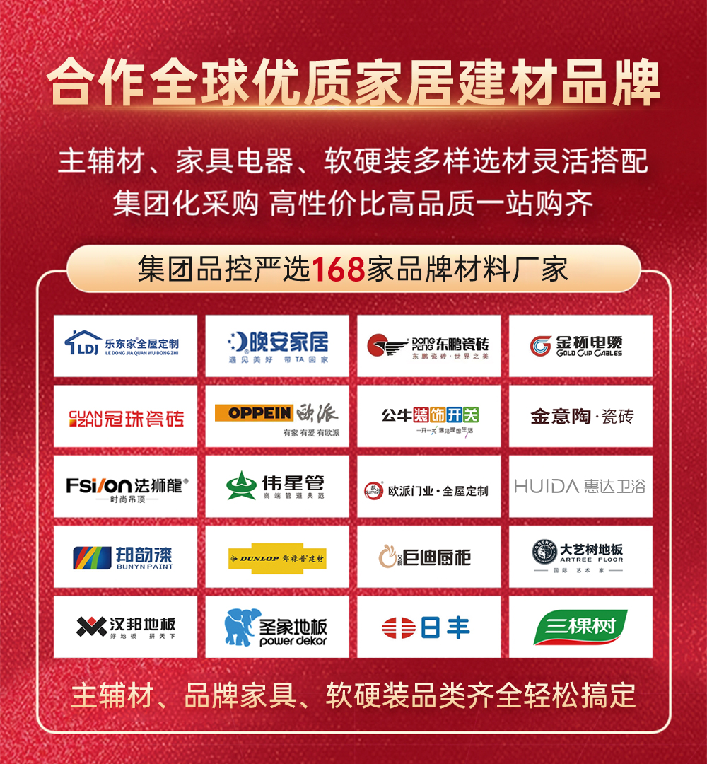 東家樂家裝聯(lián)合超百家國內(nèi)外知名品牌裝修材料廠家,組成裝修品牌聯(lián)盟,所有材料從工廠直接到工地,沒有中間商賺差價。廠家直供節(jié)省百分之30費用,嚴選國內(nèi)外一線主材品牌裝修材料工廠集中采購,環(huán)保指數(shù)超國家標準,讓家庭裝修更健康,鑄就品質(zhì)家裝。