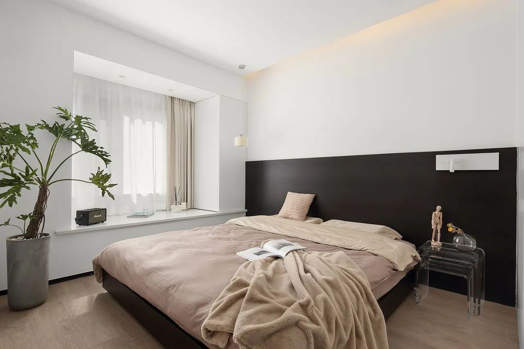 在整體明亮寬敞的空間布局下,淺灰色的墻體搭配半高的木飾面,床頭的背景墻簡潔而素雅,呈現出低調卻不簡單的質感。