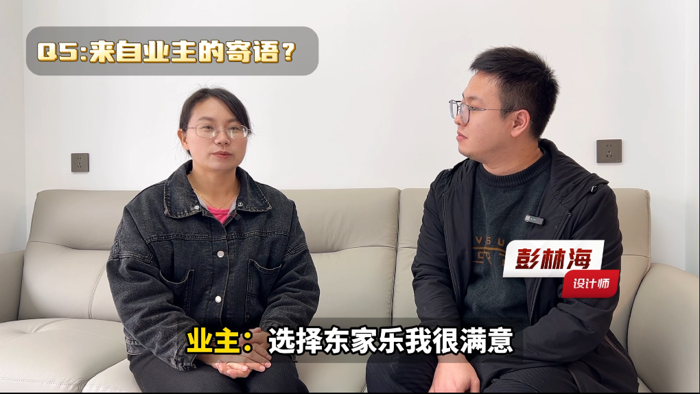 我想給到大家的是,我們在想裝修的時候,首先就是一定要去考察一個大品牌的公司,然后肯定是要找到一個非常專業的設計師,像彭老師一樣,后面的話找到這種靠譜的團隊,像你們東家樂,是一個非常專業的團隊,不管是從服務還是各方面的工藝,還有細節,還有材料這方面都是很專業的,然后也是跟承諾的這些內容都是一樣的,所以不會說后面有什么顧慮很靠譜。