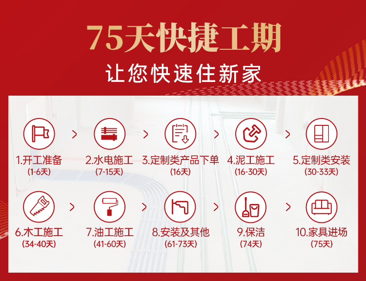 【快捷工期】快捷的75天工期東家樂定制服務量尺自己做,開工三天確定好地面鋪貼好瓷磚后的高度,不外包量尺寸,開工后一周就可以下單生產定制柜子,瓷磚貼完就安裝柜子,直接為客戶節省45天工期。過程200 多個施工節點,層層把關,有效提升施工效率,確保工程品質快速地完美落地!讓工地開口說話,讓工地形成口碑!
