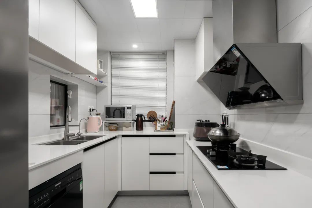 ??廚房的各種廚具、餐具等物件非常多,如果收納沒做好,很容易呈現出一種凌亂的狀態。而開放式廚房沒有任何擋隔,所有的一切赤裸裸地展現在眼前,為了保證廚房的美觀性,開放式廚房臺面不應放過多的炊具雜物。