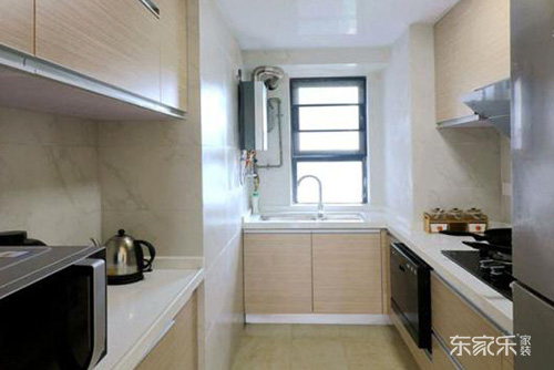 廚房是一個獨立式的小空間,打造的是一個很簡約的小廚房,運用的是原木色的櫥柜,看著比較淺色調的原木色櫥柜,巧妙的進行空間的合理利用,靠墻打造轉角的櫥柜真的是很實用,而且這樣的櫥柜與吊頂的吊柜結合,滿足了我們日常功能分區,以及儲物的多功能使用性。