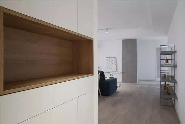 入戶視角,一股簡約風撲面而來,大面積的使用白色,讓空間寬敞又明亮。過道設計了一組置物架,擺放居家用品,保持室內(nèi)整潔。