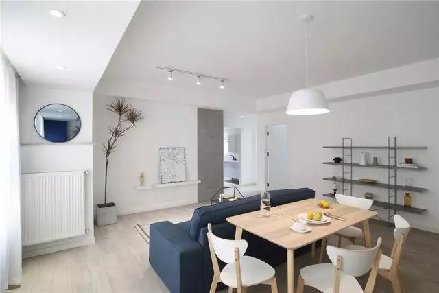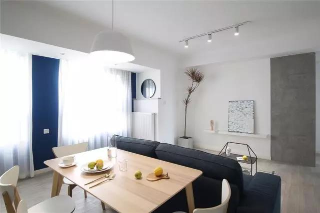 將陽臺打通并入客廳,擴大視覺空間,讓室內(nèi)更顯寬敞。客餐廳一體設計,空間重復利用不浪費。一抹藍色點綴,避免空間單調(diào),又具有自己的個性。