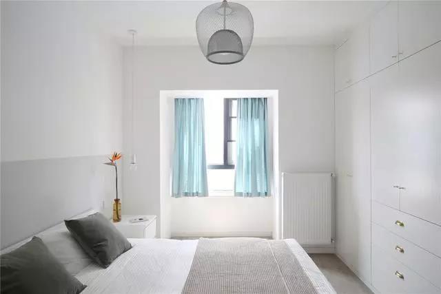 臥室簡約大方,白色為主調(diào)毫無違和感。窗簾顯得格外醒目,一抹淡藍活躍空間。床尾整排的儲物柜,為臥室提供了良好的收納空間。