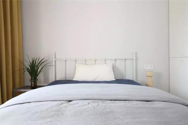 次臥延續(xù)簡約風,白色鐵藝床很符合整體風格。