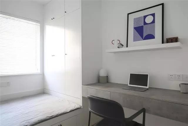 小房間榻榻米一體設計,既可以是書房,也可以是臥室,還有大量的儲物空間。隔板架取代書柜,簡易實用占用空間小,很適合小空間布置。