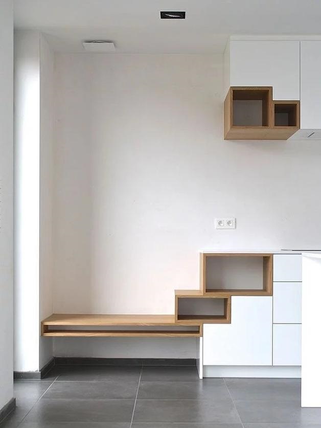 上方式鏤空的展示臺,下方是鞋柜的設計,放置在客廳和入戶門之間,可以建立一定的阻隔,使客廳保持一定的隱私設計,且不占用太多的面積,加強空間的獨立性。