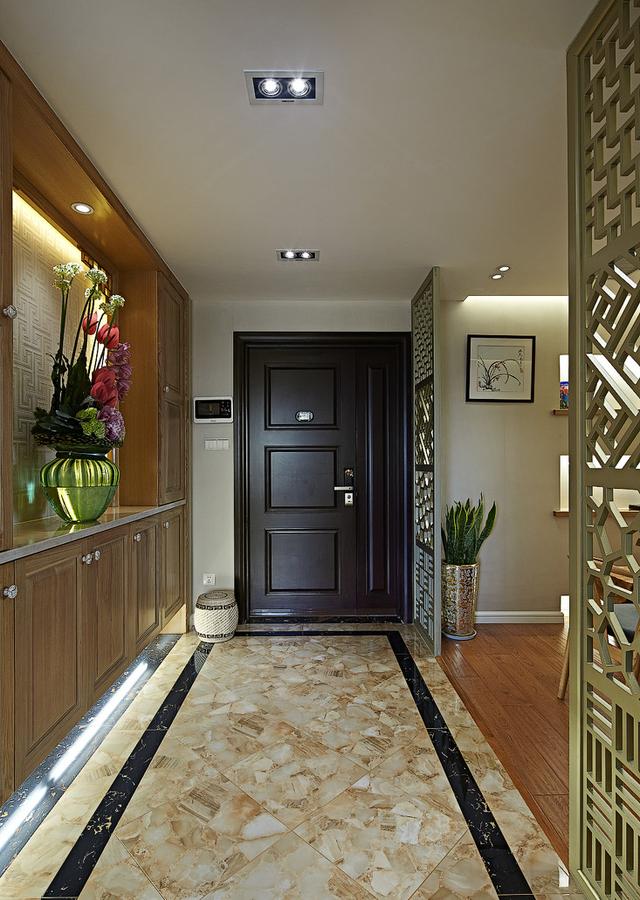 然后看入戶,厚重的大門邊上是鏤空的屏風隔斷。
