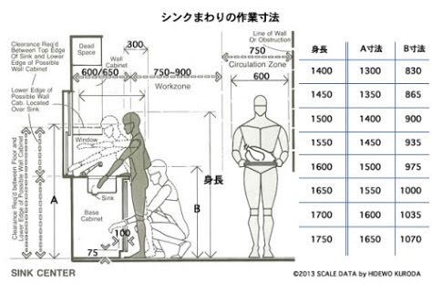 (注:左邊是下廚人的身高、中間是水槽與操作臺高度,右邊是燃氣灶區域高度)