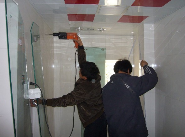 11.活動門安裝(重要環節):一般移門玻璃上已經預留了安裝輪子的孔。移門移動需要借助滑輪,首先需要安裝上移門上方的兩個輪子,將輪子安上后,放置到相應位置,然后再調試安裝下方輪子。裝好活動門的五金件,將合葉裝于固定門預留孔處。裝好后調整荷葉的軸芯位置,到關門手感最佳為止。12.防水(重要環節):根據需要在玻璃側面或下方安裝吸水條或擋水條。用硅凝膠密封鋁與墻壁、玻璃和底盆之間的接縫。淋浴房基本安裝后,鋁框和墻壁涂上玻璃膠,可有效防止日后滲水。
