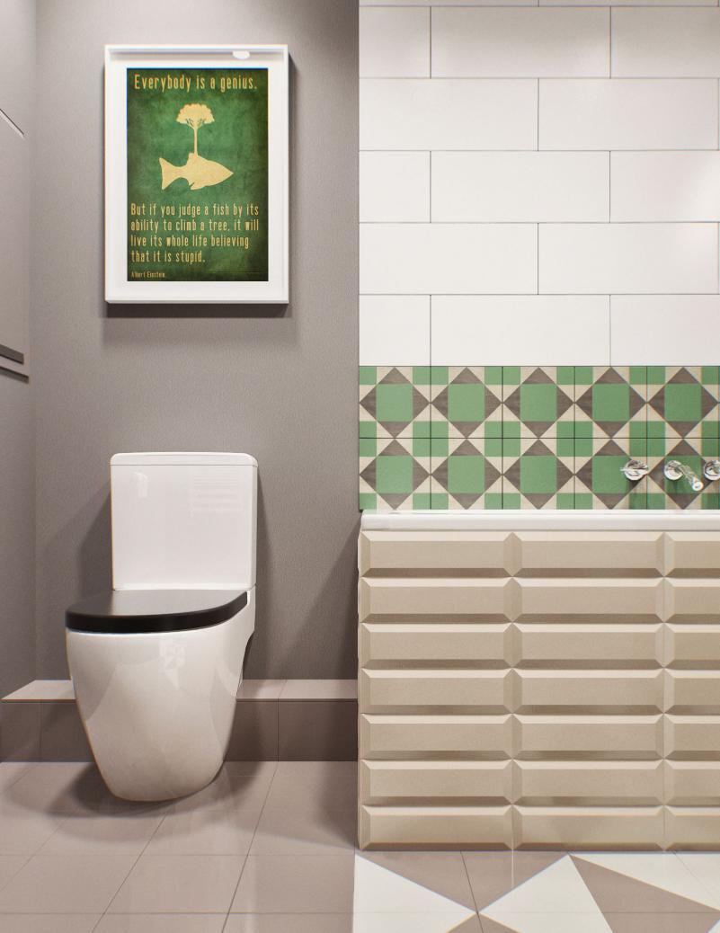 淺色的瓷磚,用綠色做點(diǎn)綴,營造出室內(nèi)空間的豐富感。地面不同的瓷磚鋪貼方式,將功能區(qū)更加清晰的劃分。