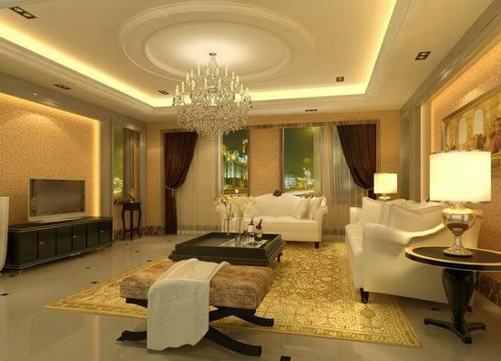 這款歐式裝修風格具有很深的文化氣息,在色彩上運用了淡黃色、米白色等古典色來渲染整個客廳,營造出高貴大氣的既視感。同時黃色的燈光與白色的墻面相互交織,它們自己形成的一幅溫暖美好的畫面也是這個室內的焦點。